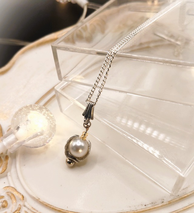 ほおずきをイメージしたネックレスです。 【サイズ】 モチーフ:1cm トップ全長:2.5cm チェーン:37㎝+アジャスター4cm 【素材】 モチーフ:錫、パール、ビーズ 金具部分:ステンレス